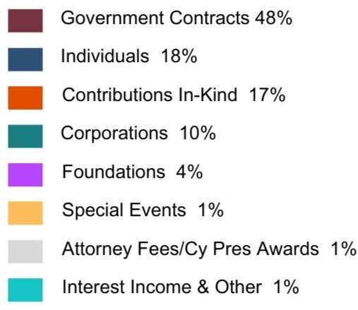 **In-Kind: Pro bono volunteers donated 4,555 hours of services valued at $3,307,226, representing most of this amount.